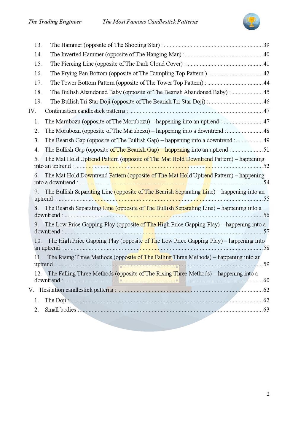 64 pages of pure knowledge, only useful information about the meaning of each candle, each pattern. You must know them by heart if you want to perform on the markets. Among them :