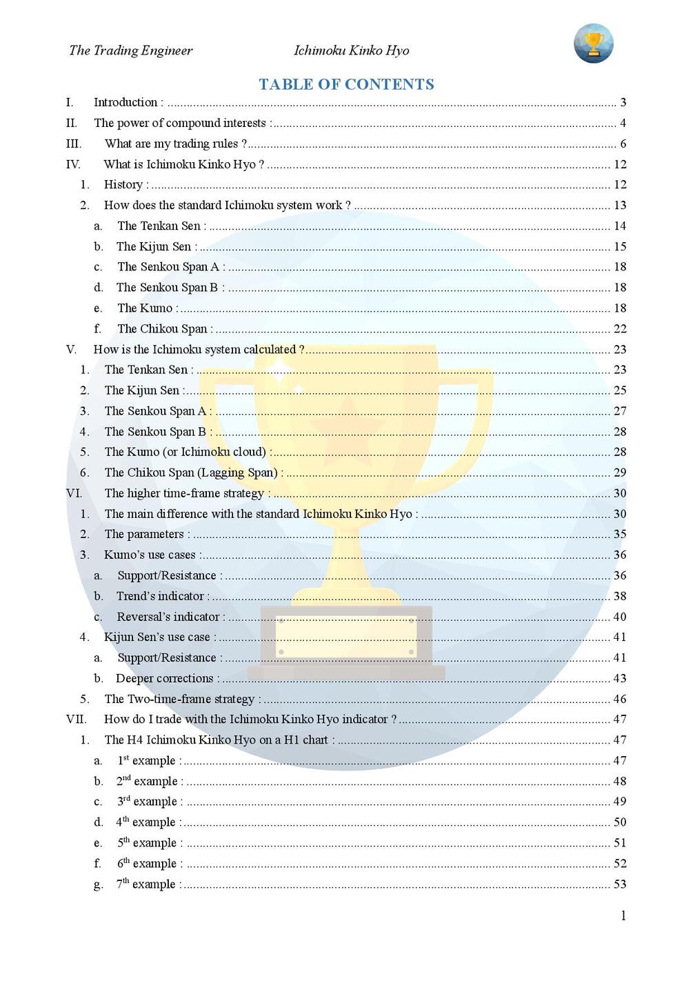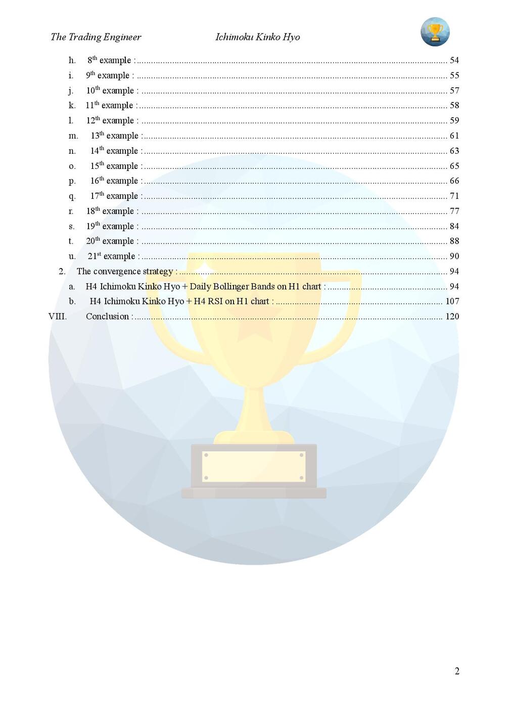 This eBook about Risk Management, Compound Interests, my trading rules & Ichimoku Kinko Hyo (calculation, concepts, theory & practice, common use, my multiple timeframes & convergence strategies, etc) + 639-page eBook of trading exercises (Price Action & technical indicators like RSI, Bollinger Bands, Ichimoku Kinko Hyo, MACD)
